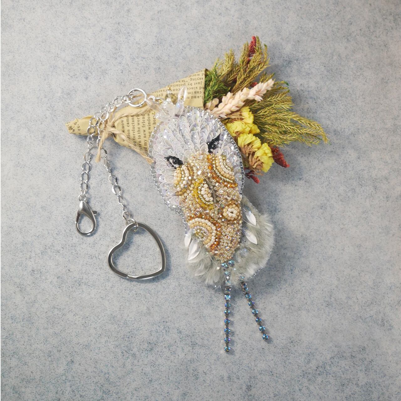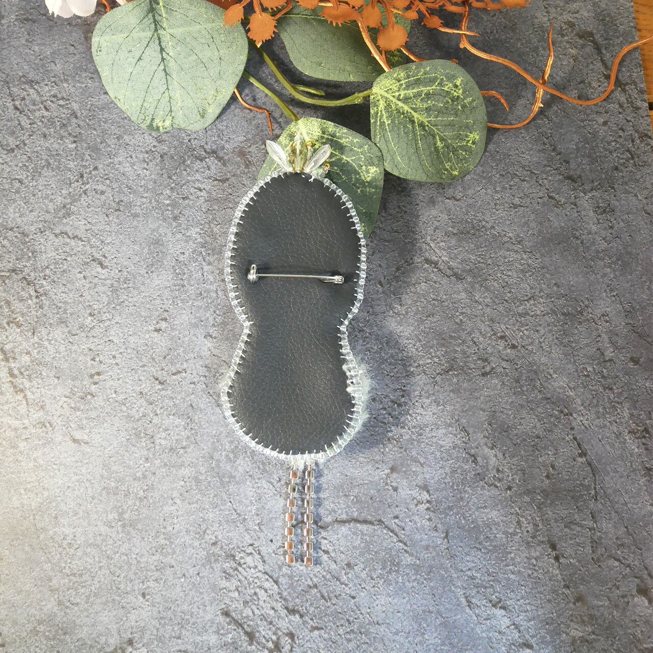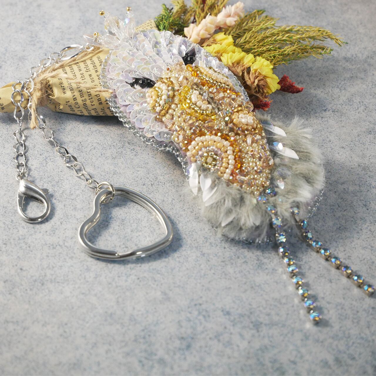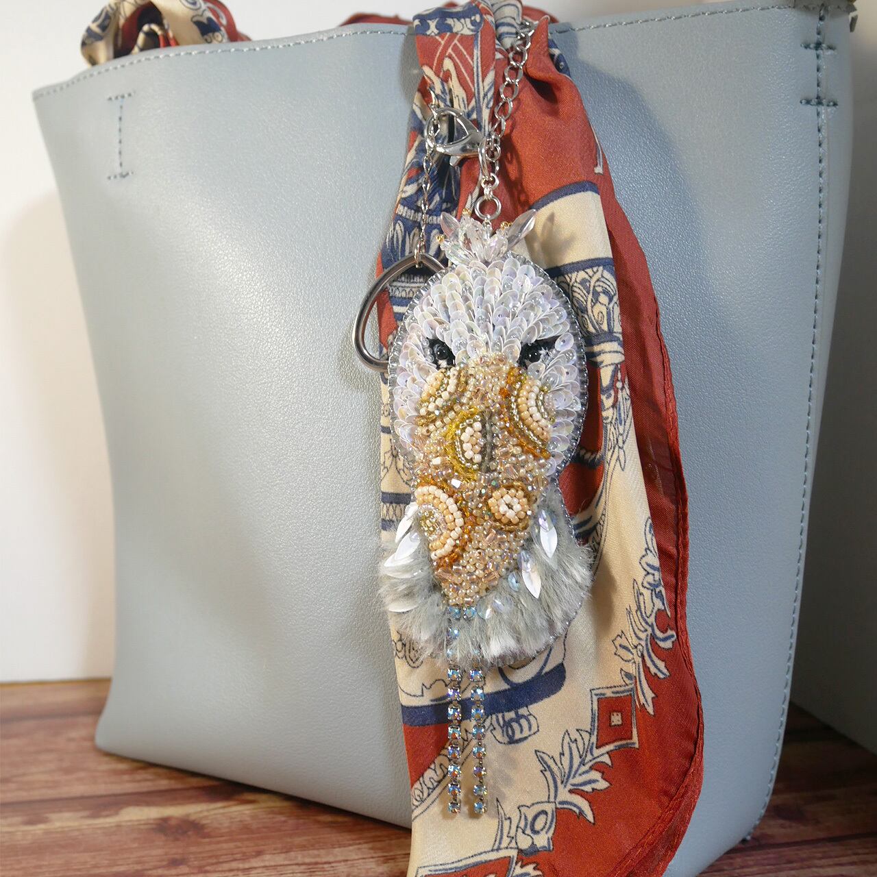 そんなハシビロコウをフランス製ビーズやスパンコールを使い、半立体に仕上げました。作品の裏側にブローチピンを縫い付けています。お洋服やストールなどに付けていただくこともできますし、取り外し可能なキーホルダーチェーンでカバンなどに取り付けることもできます♪